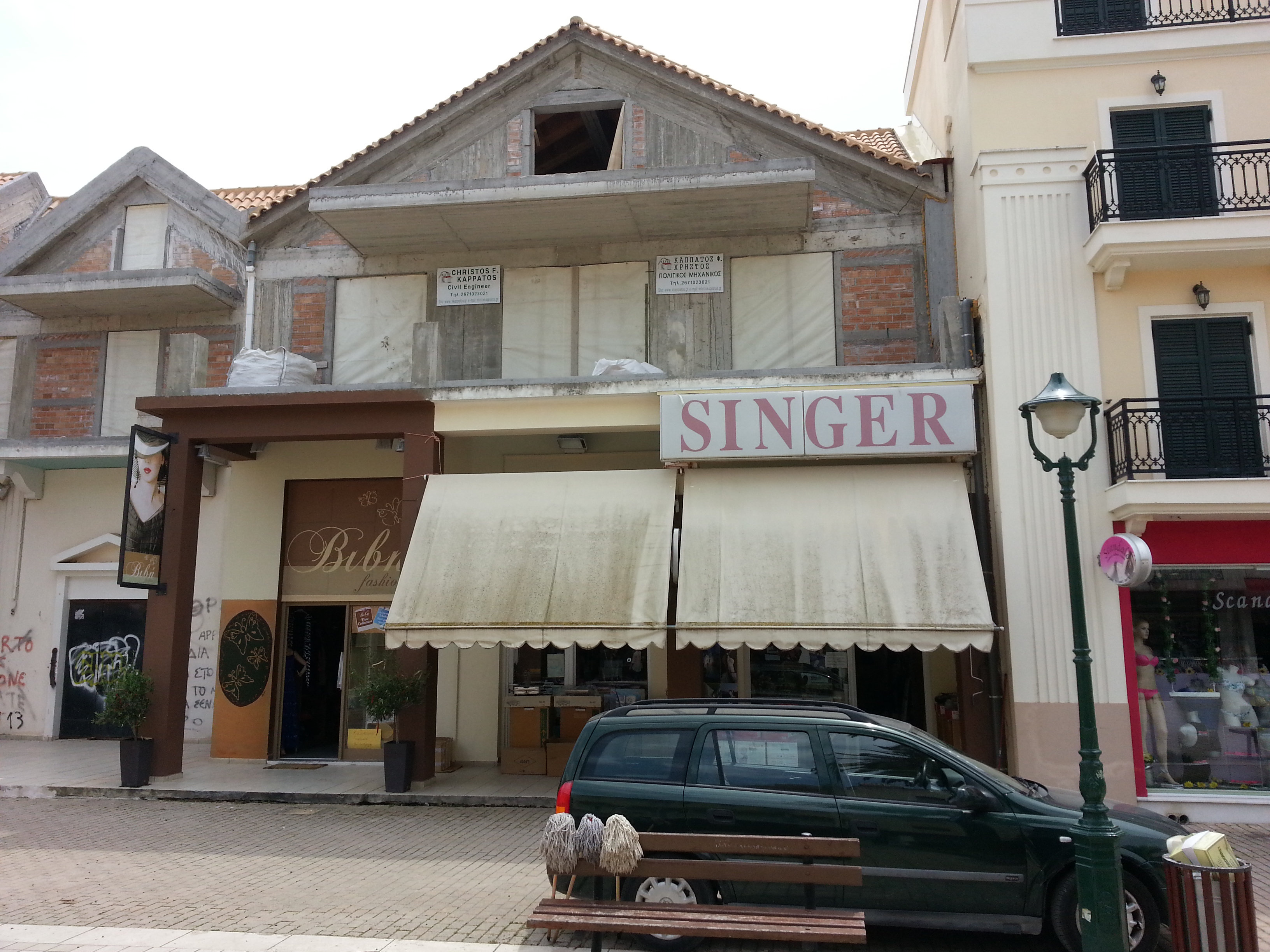 In het voorjaar was ik voor een vakantie op het Griekse eiland Kefalonia. Het eiland was een paar maanden daarvoor zichtbaar getroffen door een stevige aardbeving; huizen waren kapot en de weg was soms een beetje weg. Ik bezocht er het stadje Argostoli en mijn aandacht werd getrokken door een (winkel?)pand met een opschrift ‘SINGER’. Deze naam roept bij mij ogenblikkelijk het beeld op van mijn Singer trapnaaimachine. Die had ik, toen ik een jaar of 16 was, op een rommelmarkt gevonden en heb ik opgeknapt en werkend gemaakt. Ik kon nog onderdelen zoals een leren aandrijfriem en een spoelhuisje op de kop tikken bij een gepensioneerde naaimachinemonteur in Borculo. Hij wist alles van deze machine! Zijn naam week ik helaas niet meer. Ik heb jarenlang met plezier veel gebruik gemaakt van mijn Singer! Heb er ook spijt van dat ik ‘m bij een verhuizing weer naar de kringloopwinkel heb gebracht. Afijn!