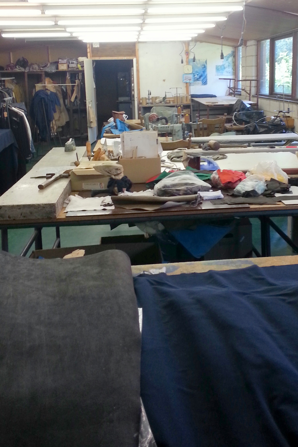 In de zomer van 2014 heb ik hen bezocht in het atelier in Brabant. Ik trof een grote ruimte van tientallen meters lengte met grote snij- en werktafels en een aantal industriële naaimachines. En een rek met allemaal proefmodellen en patronen, verder rekken met allerlei kleuren huiden. Mooi om te zien en heerlijk, de geur van leer.