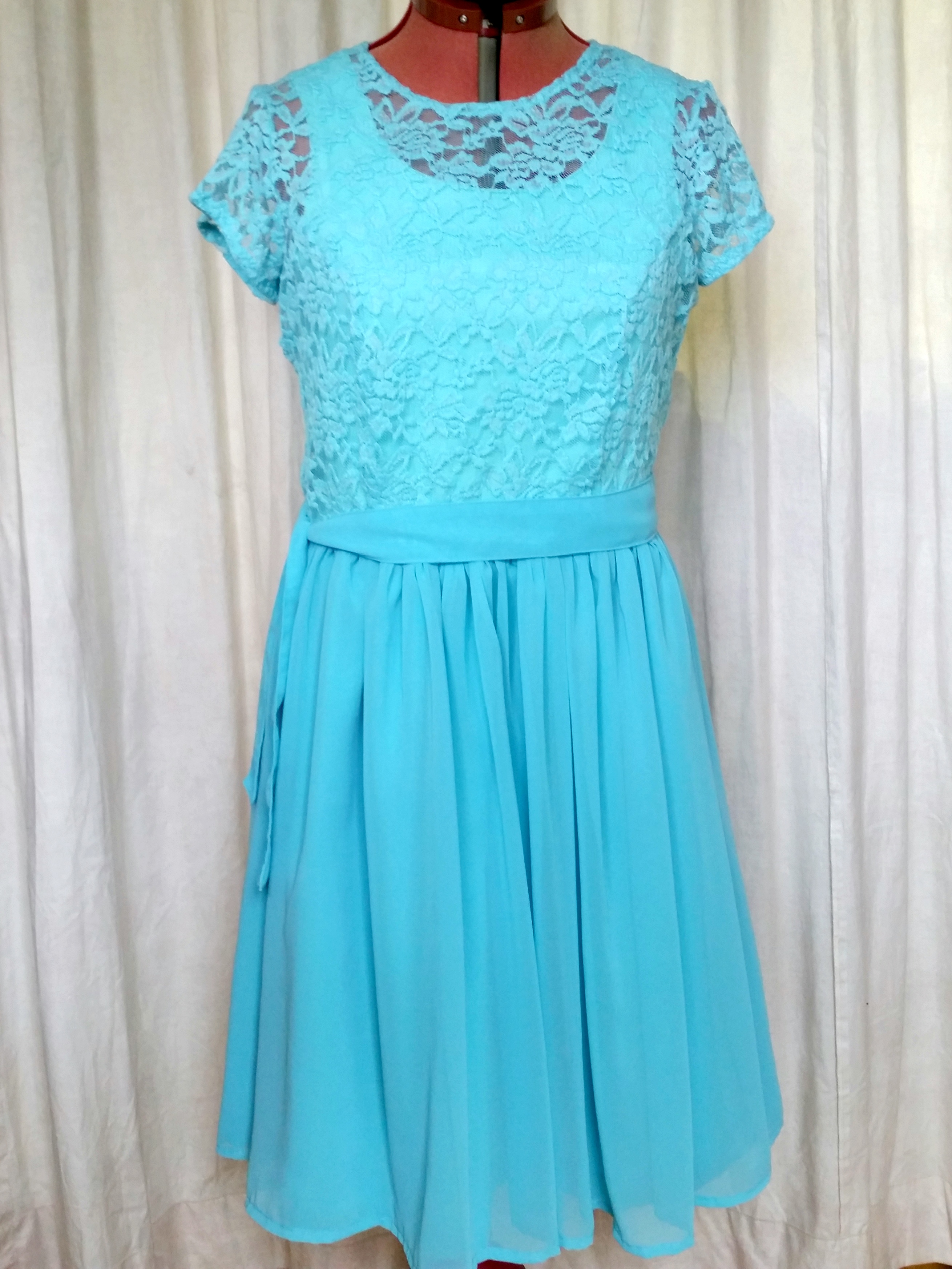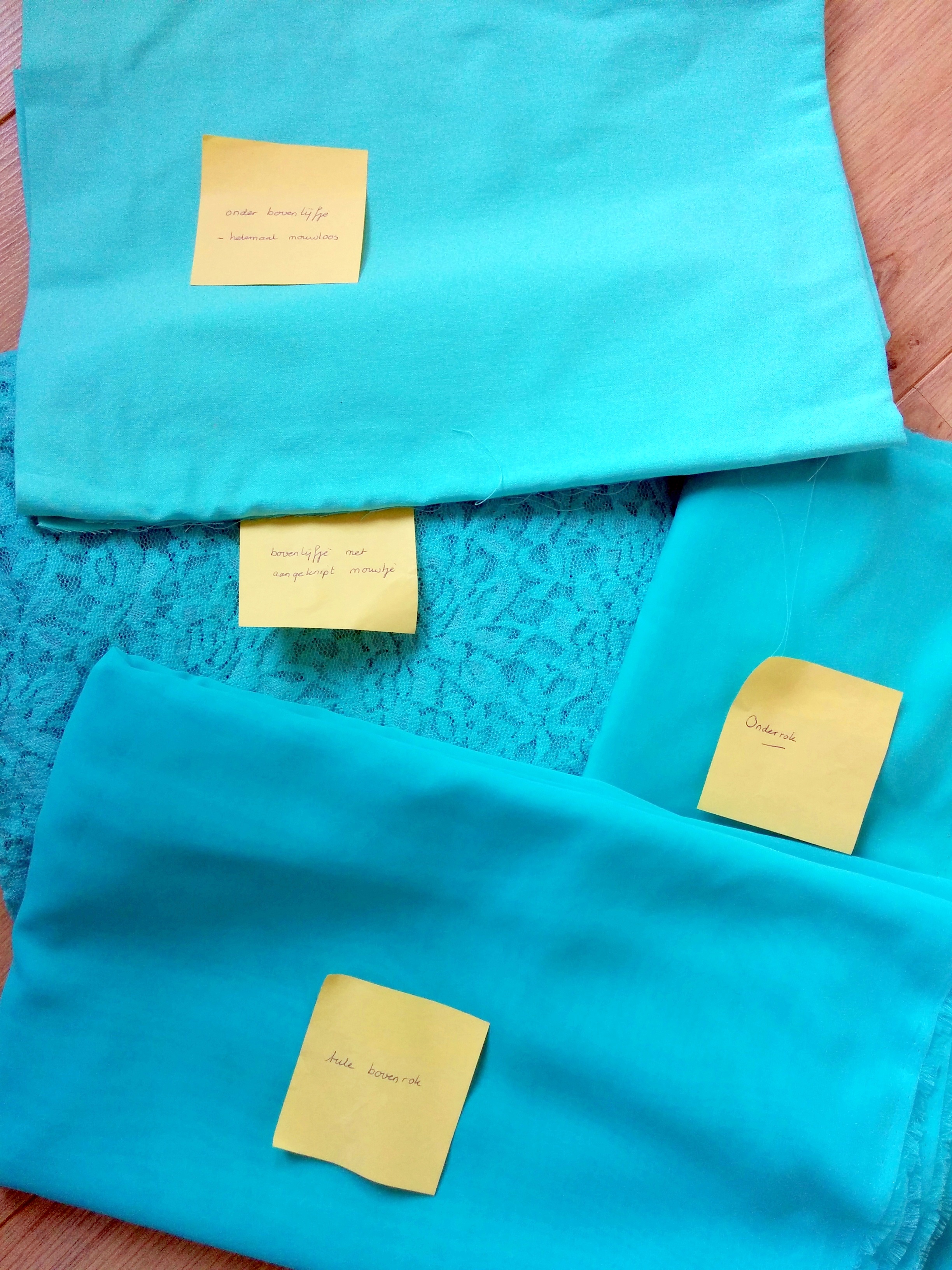 De aanstaande bruid heeft alles al uitgezocht voor Lia; het model voor de jurk en ook de stoffen! Het wordt een prachtige azuurblauwe jurk met een zwierige rok en een kanten bovenlijfje. In Canada gaat een kleermaker aan de slag met het vervaardigen van jurken voor de twee Canadese bruidsmeidjes. Lia krijgt vanuit Canada vier stoffen opgestuurd. En dat brengt Lia bij mij; of ik haar jurk wil maken? Met een in Engels geschreven patroon en de maten in inches……