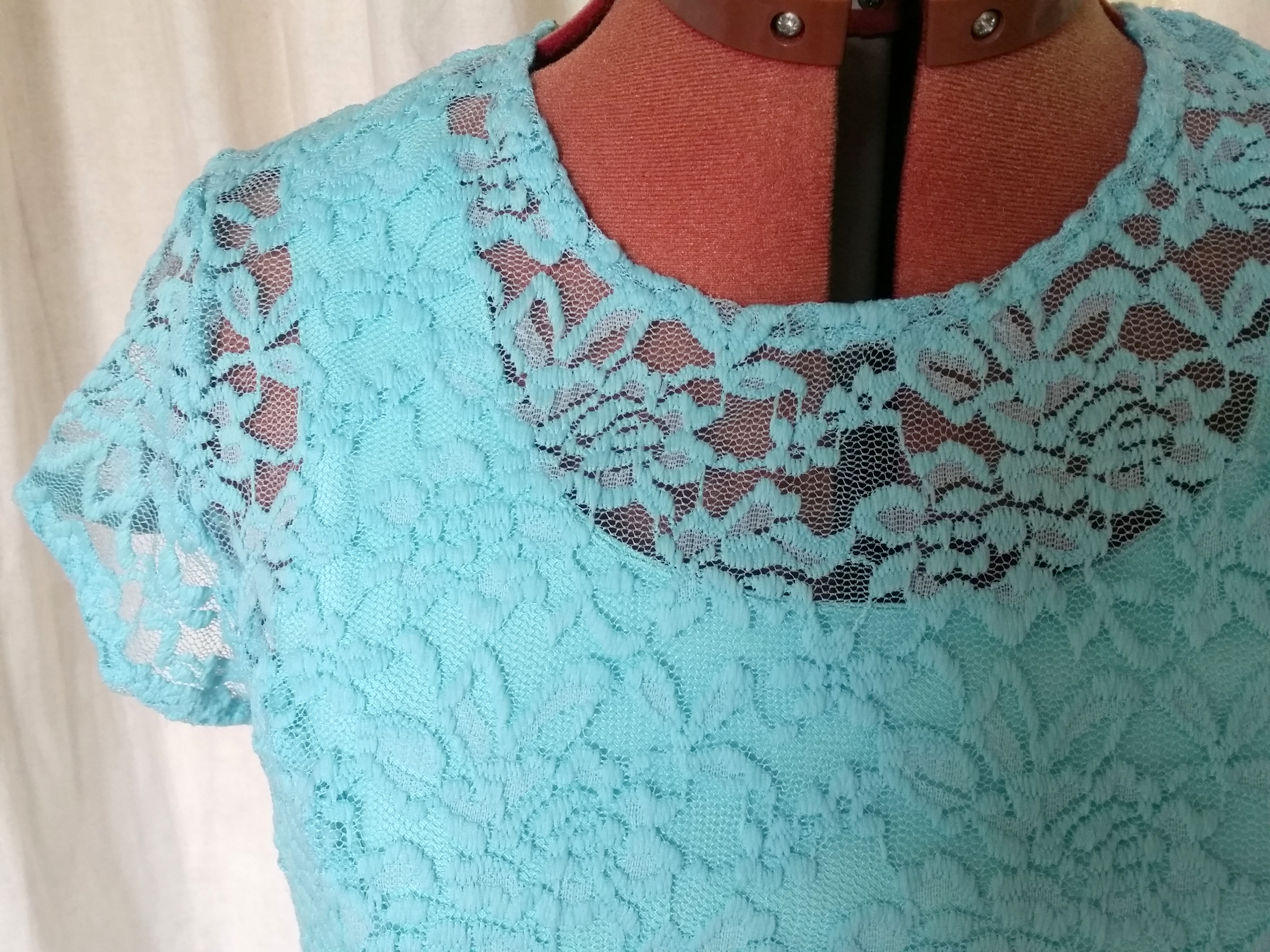 Het past helemaal goed. Mede dankzij de rekbare stof van het bovenlijfje is er voldoende beweegruimte in de jurk. Wie weet is dit een jurk die Lia nog vaker zal dragen samen met de zilverkleurige pumps en oorbellen. Het lukt niet om de intens blauwe kleur goed weer te geven op de foto. Maar het is een pláátje toch?