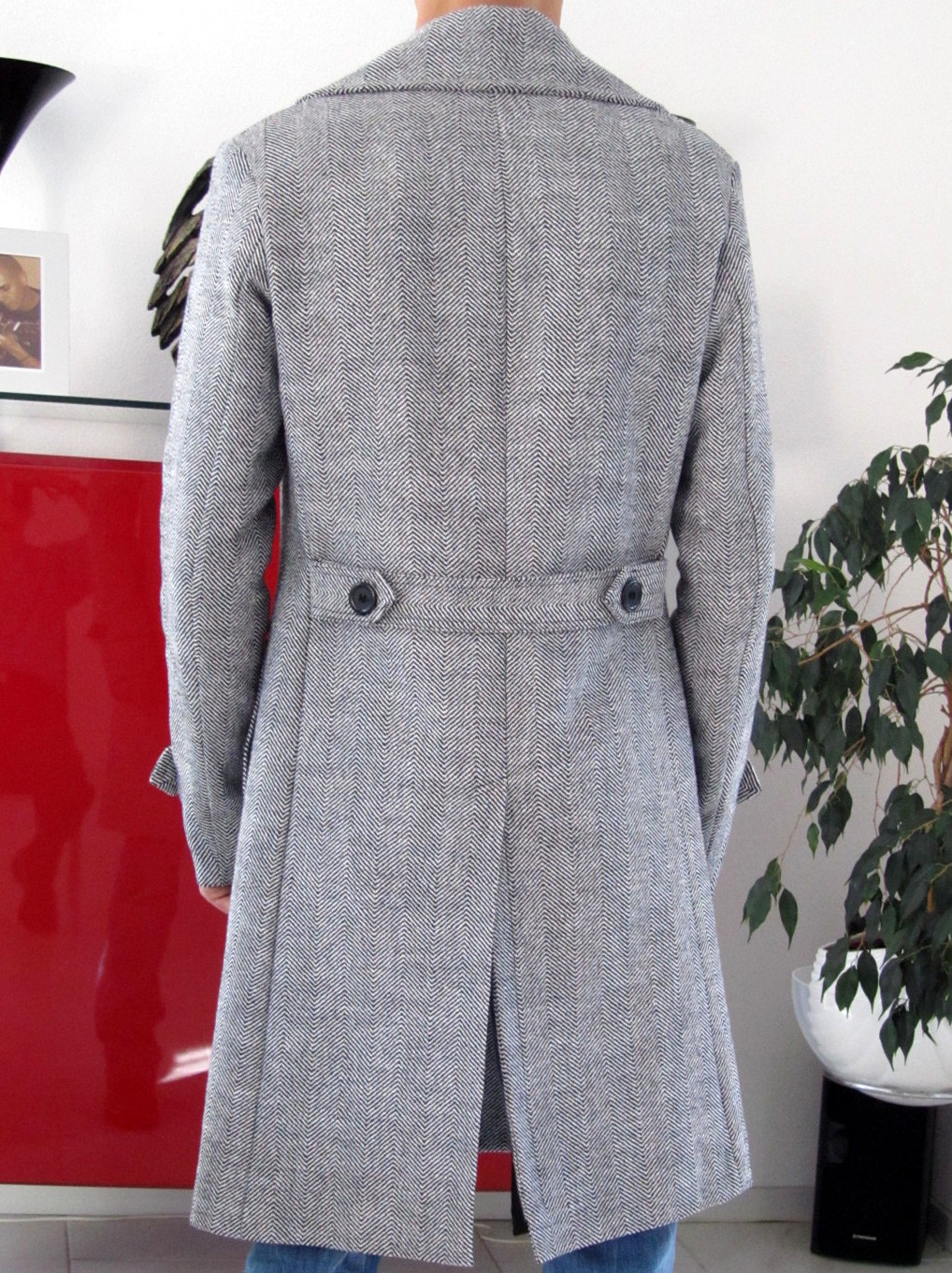 Voor mij een mooie uitdaging om de jas te gaan maken. Angelo gaat op zoek naar een passende stof; hij weet precies wat hij zoekt; het wordt een grove visgraatstof. Deze bestelt hij op een Amerikaanse webshop; de stof was daarmee enige weken onderweg. In overleg met Angelo heb ik eerst een proefmodel gemaakt van een lapje stof van de markt, zodat we beiden zeker weten dat de nieuwe jas helemaal gaat worden zoals Angelo dat voor ogen heeft.