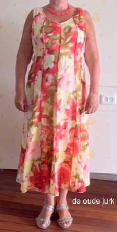 Heel graag wil José dus dat ik heel precies díe jurk in een nieuwe stof ga maken. Zo gezegd zo gedaan. Met enige tips kon José op pad om zelf de juiste stof te kopen, zodat de jurk ook precies gaat dragen als de oude jurk. José is helemaal niet georiënteerd op stoffenwinkels of de lapjesmarkt dus het is even zoeken en ontdekken! Het liefst koopt ze precies dezelfde stof als van haar versleten jurk. En dat kan ik me goed voorstellen want bij het zien van de ‘oude’ jurk wordt mij meteen duidelijk waarom José zo dol is op deze jurk. De belijning in combinatie met de zwierige vorm van het rokdeel en de prachtig gekleurde bloemenprint maken de jurk samen tot wat het is. Een jurk die José’s lichaamsvorm goed tot zijn recht laat komen.